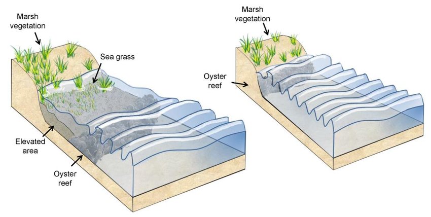 Left: Oysters reef somewhat more seaward demonstrating shoreline growth by reducing wave action; Right: Oysters at the shoreline demonstrating high wave energy.